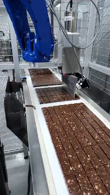 This cutter is of the single-blade type, with programmable positioning (parallel and transversal) thanks to a compact, high-speed 6-axis handling robot and a blade with ultrasonic technology.